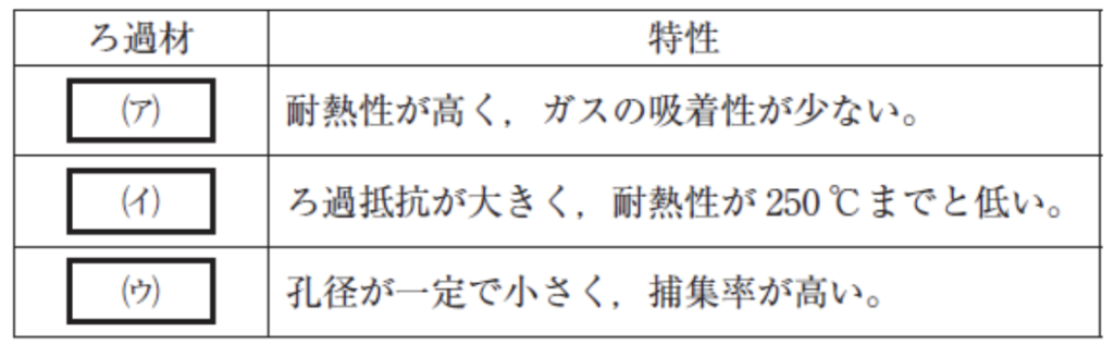 設問の文脈では、(ア)が最も耐熱的・重量安定的、(イ)が耐薬品・疎水的、(ウ)が精密捕集用という順であり、この条件に最も合致する組合せが解答のものです。